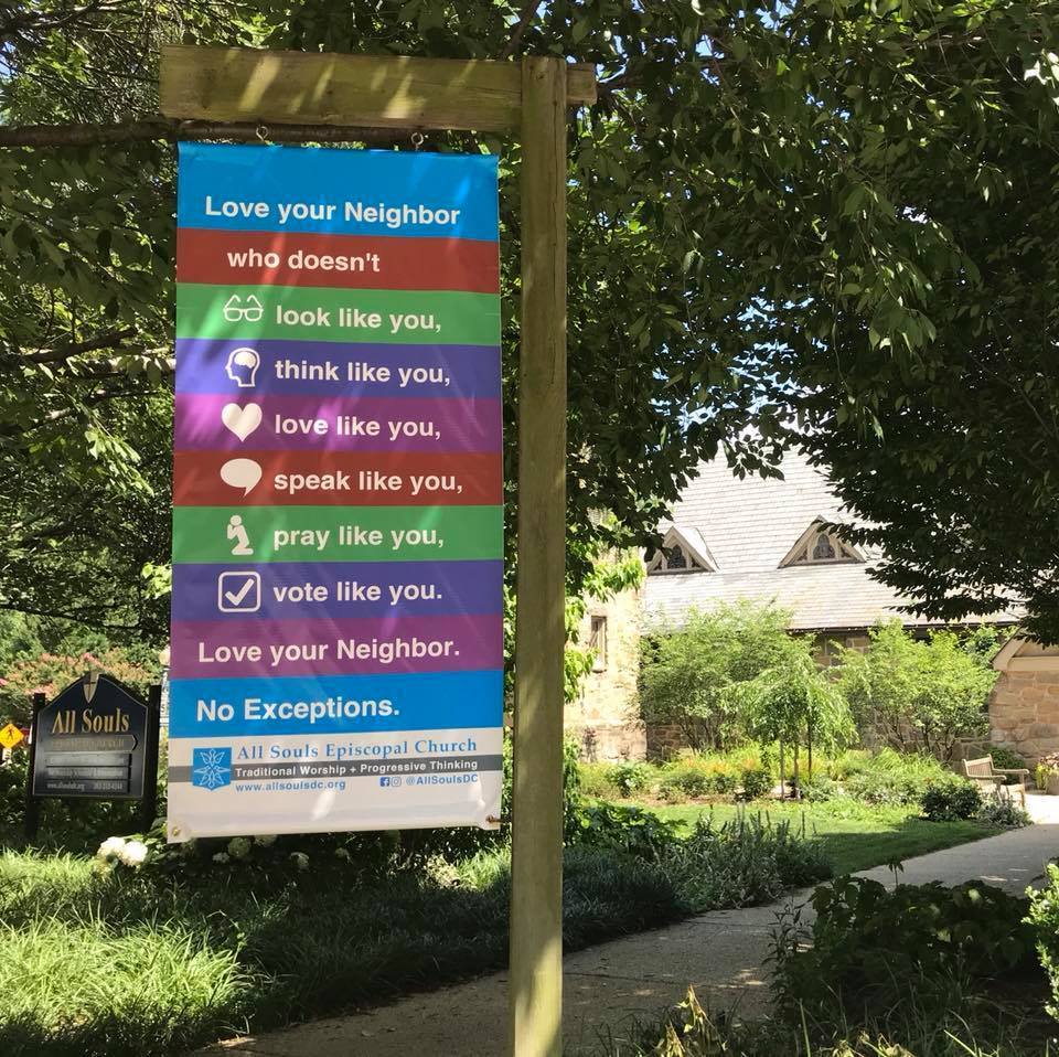 This banner was originally designed for use at All Souls Episcopal Church in Washington, DC. Here in DC there are banners and placards about different positions all over the place. One day earlier this year our rector was walking past another church that had posted a banner encouraging people to love people, with a long list of very specific characteristics. It inspired him to design a banner to put in front of our church that would transcend any particular political ideology while still speaking into our present moment . . . living into our founding vision to be a "church for all souls."